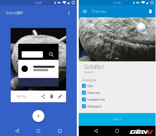 Bên cạnh đó, bạn còn có thể tùy chỉnh lại giao diện của Android để phù hợp với từng ứng dụng. Tuy nhiên ThemeDIY chưa cung cấp nhiều các lựa chọn thiết kế để người dùng sáng tạo. Và cuối cùng là các lựa chọn thiết lập về font chữ, hình nền màn hình chính, lockscreen và màn hình khởi động.