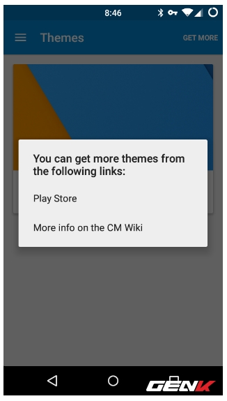 Tại đây hiện tại bạn chỉ thấy một giao diện duy nhất được thiết lập mặc định. Đây sẽ là khu vực chứa giao diện mà bạn sẽ truy cập vào và lựa chọn giao diện để sử dụng sau khi đã khởi tạo xong. Trường hợp nếu bạn muốn khám phá thêm các giao diện được tạo sẳn, hãy nhấp vào Get More và lựa chọn nơi chứa các giao diện được thiết kế sẳn như Play Store hay CM Wiki.