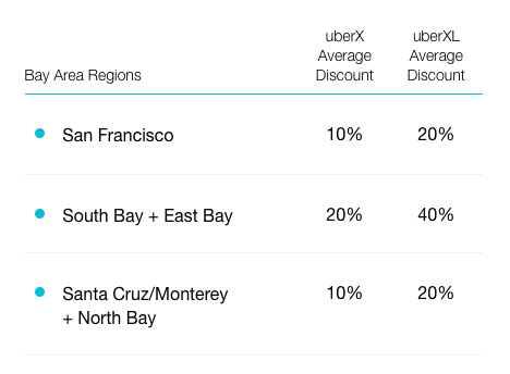 Mức giảm giá của Uber tại các thành phố là không giống nhau. Tại San Francisco, mức giảm chỉ là 10% theo email của Uber gửi tới các khách hàng, nhưng tại các thành phố khác mức giảm giá lại nhiều hơn và có nơi lên tới 40%.
