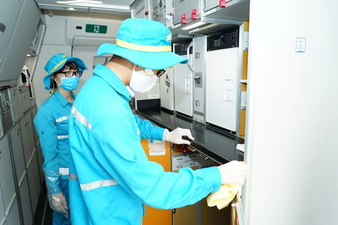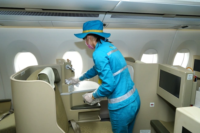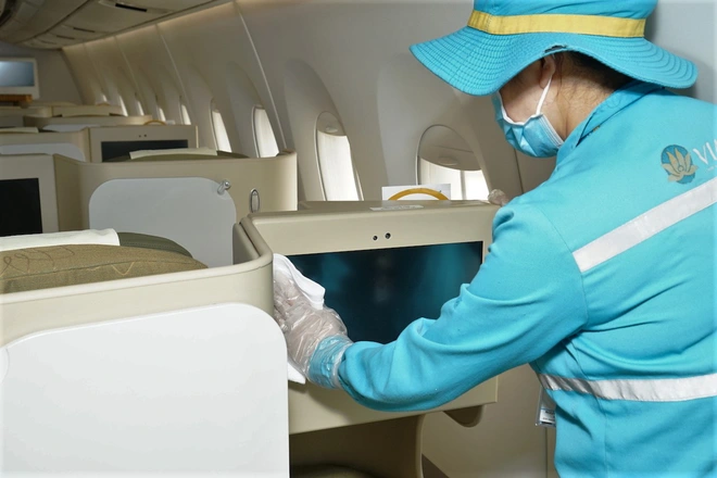 Toàn bộ khoang hành khách, phòng vệ sinh, bếp… trên máy bay đều được vệ sinh khử trùng. Các nhân viên vệ sinh được bảo hộ bằng khẩu trang kháng khuẩn, găng tay hai lớp và mũ.