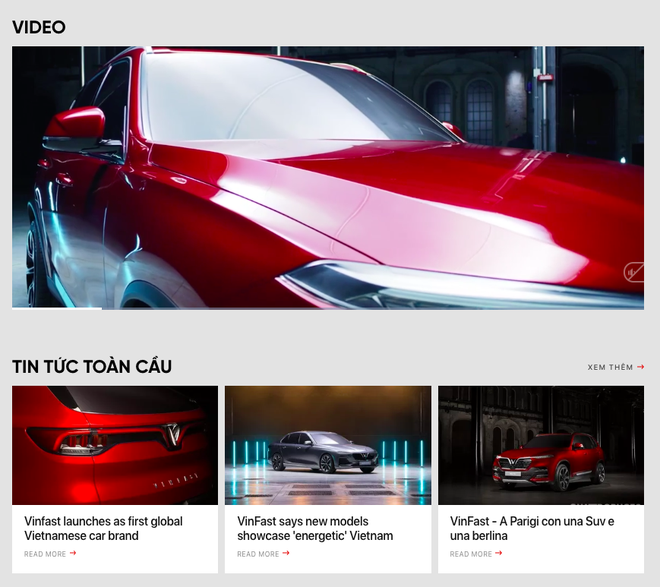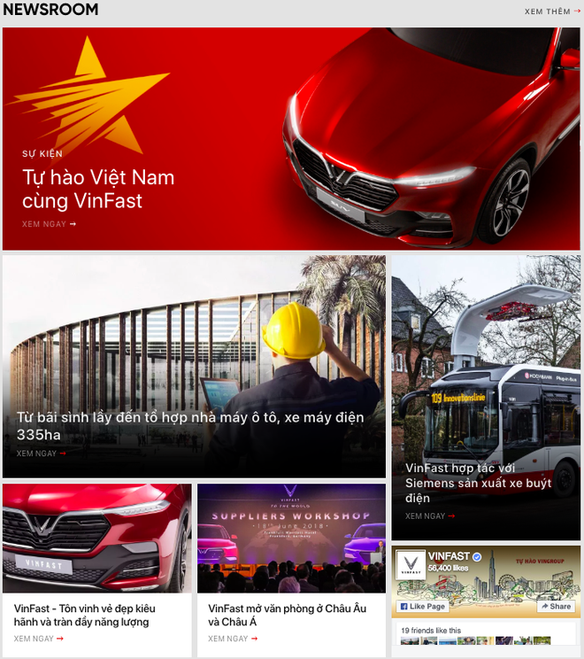 Phía bên dưới là "Newsroom" (Phòng tin tức) với những thông tin, sự kiện trong nước và quốc tế có liên quan tới VinFast. Xen giữa chính là video giới thiệu 2 mẫu xe sẽ được ra mắt tại triển lãm Paris Motor Show.