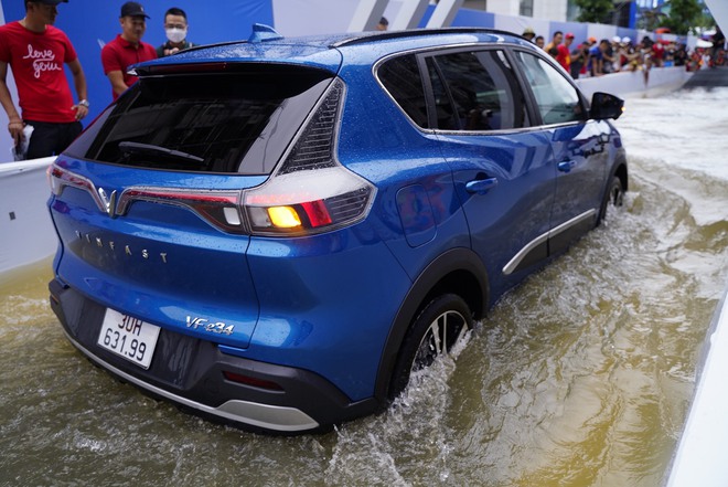 Đường thử được bố trí có chiều rộng gấp khoảng 1,5 lần chiều rộng của VF e34, độ sâu nửa mét. Khi kỹ thuật viên điều khiển xe rẽ nước đi, những đợt sóng tác động lớn vào thân xe. Nước chồm lên ca-pô, ngập quá đèn, tuy nhiên chiếc xe vẫn phăm phăm lao về phía trước mà không gặp bất kỳ khó khăn nào.