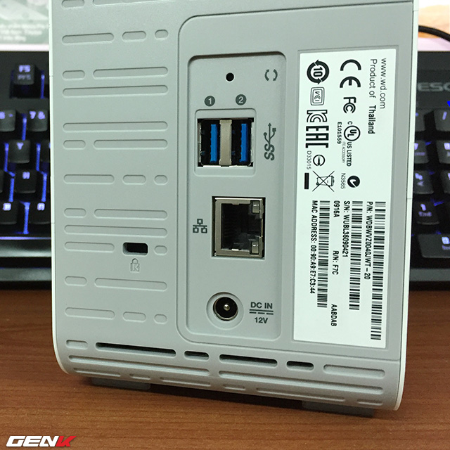 Số cổng giao tiếp của My Cloud Mirror rất khiêm tốn, chỉ có 1 cổng Ethernet để kết nối với modem wifi và 2 cổng USB 3.0 để mở rộng dung lượng.