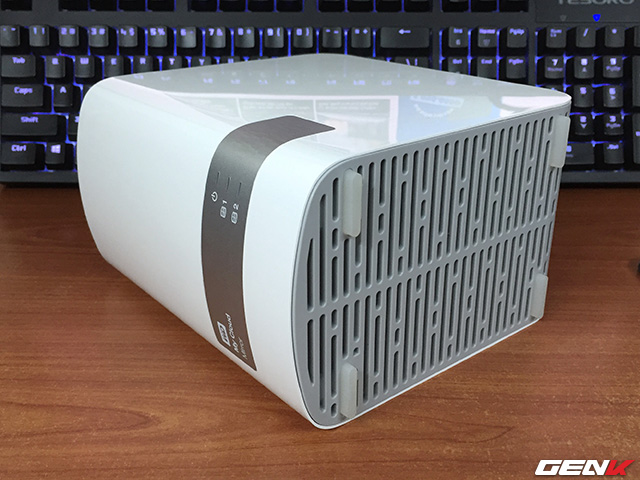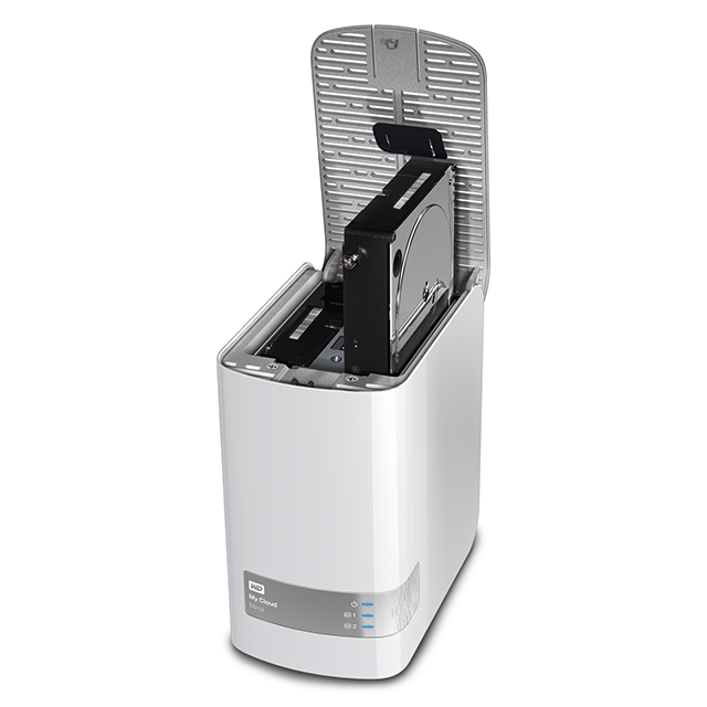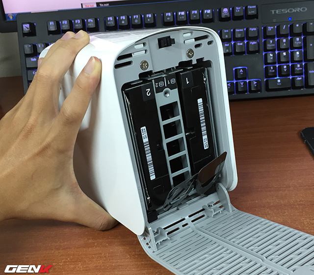 Mặt trên có chốt bấm, có thể mở ra và thay HDD rất dễ dàng. My Cloud Mirror có thể gắn 2 HDD, hỗ trợ RAID 0 và RAID 1.