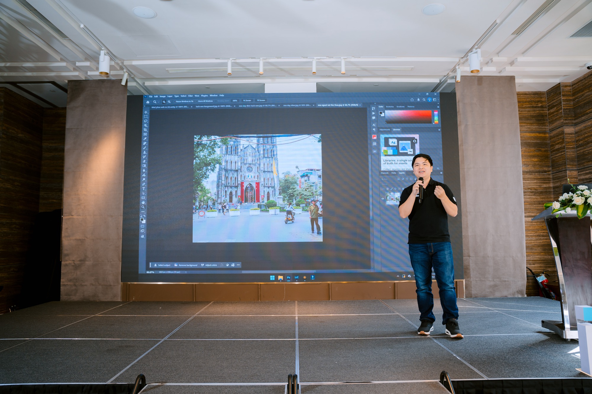 Trong buổi hội thảo, nhiếp ảnh gia Nguyễn Hoàng Phúc cũng đã thể hiện khả năng xử lý ảnh trên AI PC với các tác vụ như tách nền, chỉnh màu, tăng độ phân giải và tăng cường chi tiết. Những thao tác này được thực hiện nhanh chóng trên AI PC, thay vì phải thực hiện nhiều bước chỉnh sửa thủ công như trước.